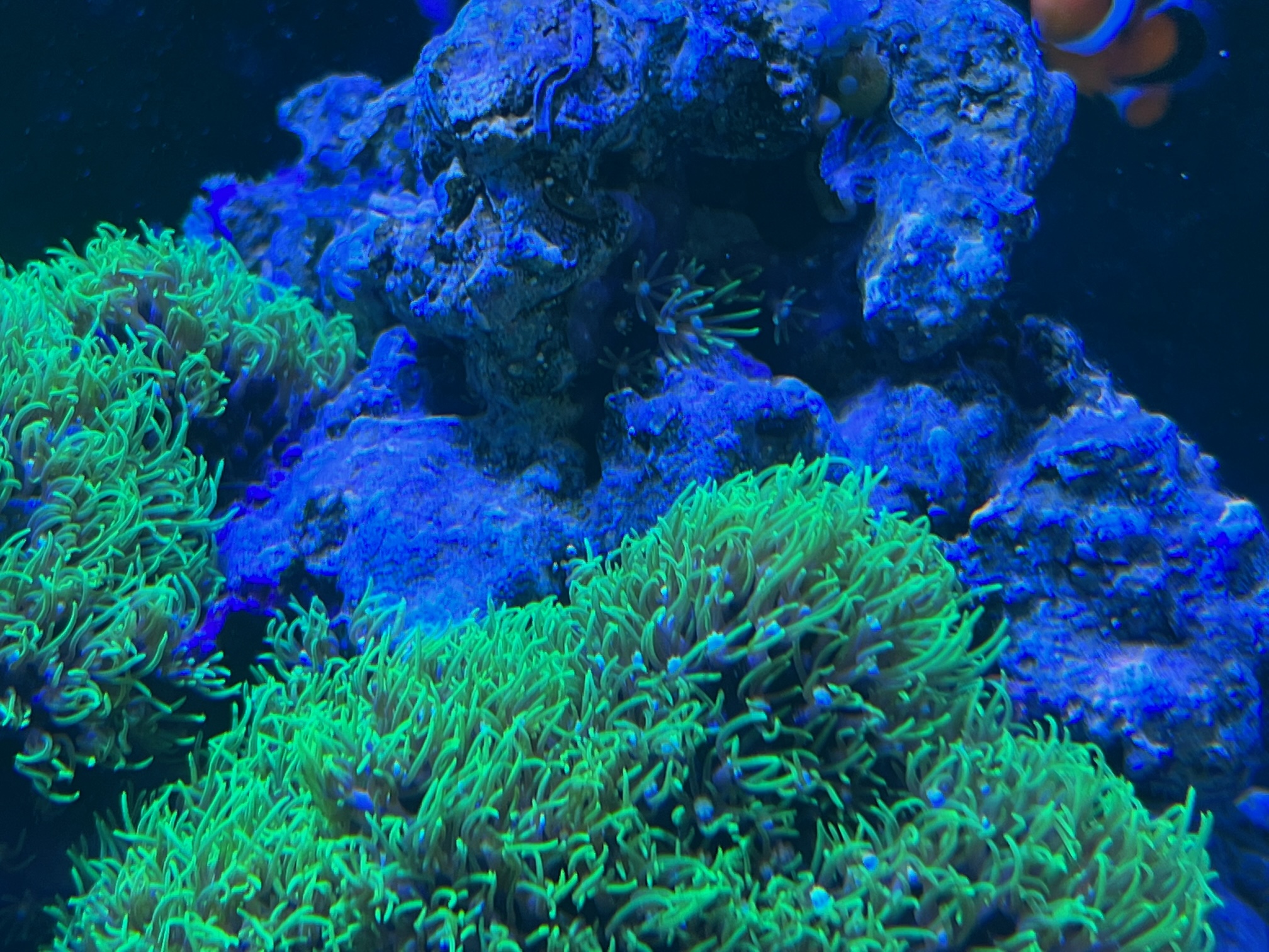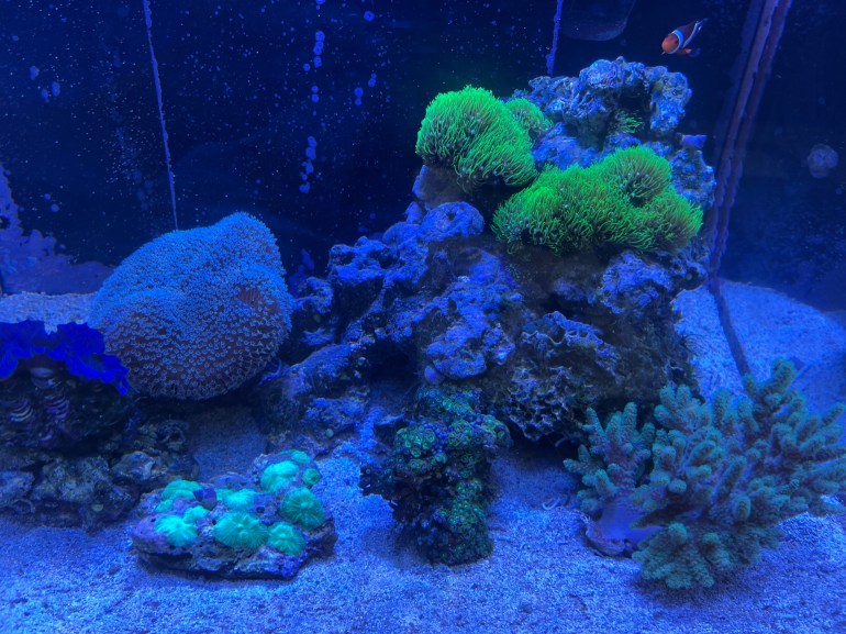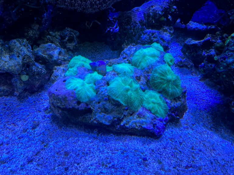 以前はオレンジのディスクコーラルと蛍光グリーンのバブルディスクコーラル(表面にプクプクの突起があるディスクコーラル)がいたのですが、例の「水槽がお風呂になっちゃった事件」で☆になってしまいました。