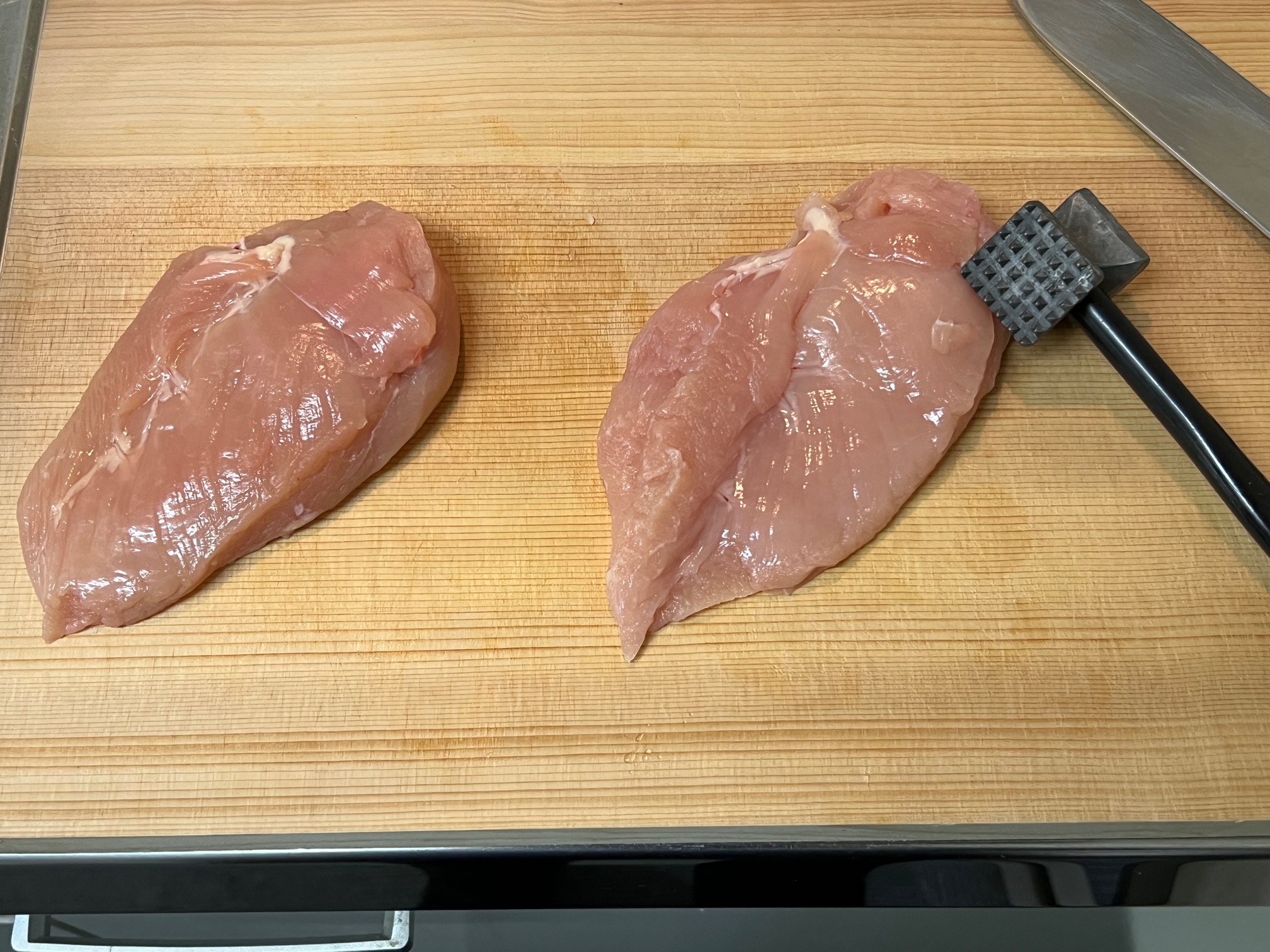 肉の方は筋切りをして、写真にあるトゲトゲハンマーみたいな道具でシバいていきます。