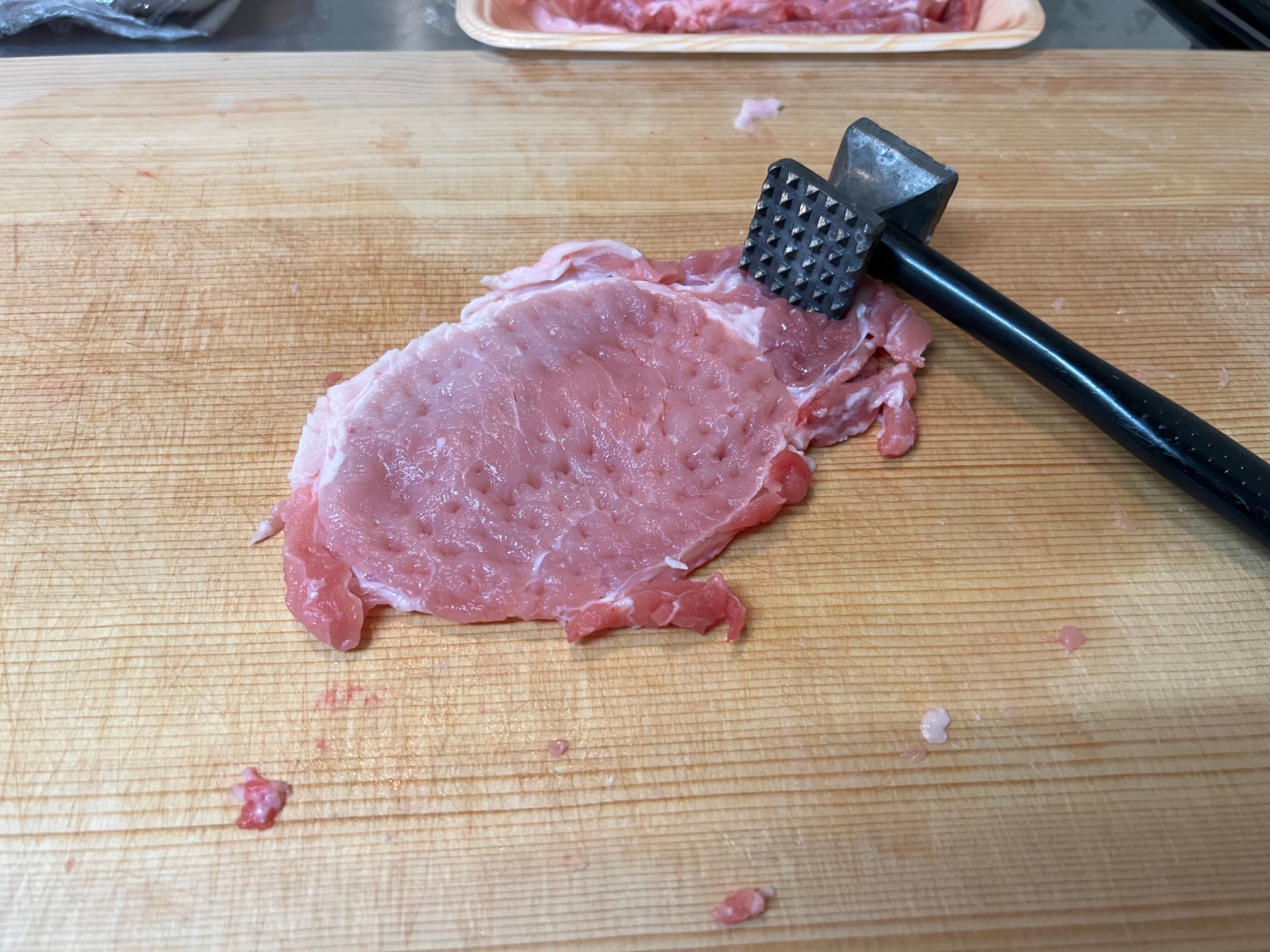 前回トンカツが丸まってしまったので、前回よりは少し細かく筋切りをする様にしてみました。