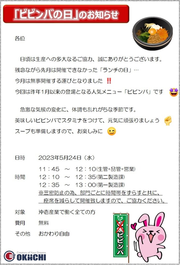 で、今回のメニューは、チラシの通り「ビビンバ」に決定。