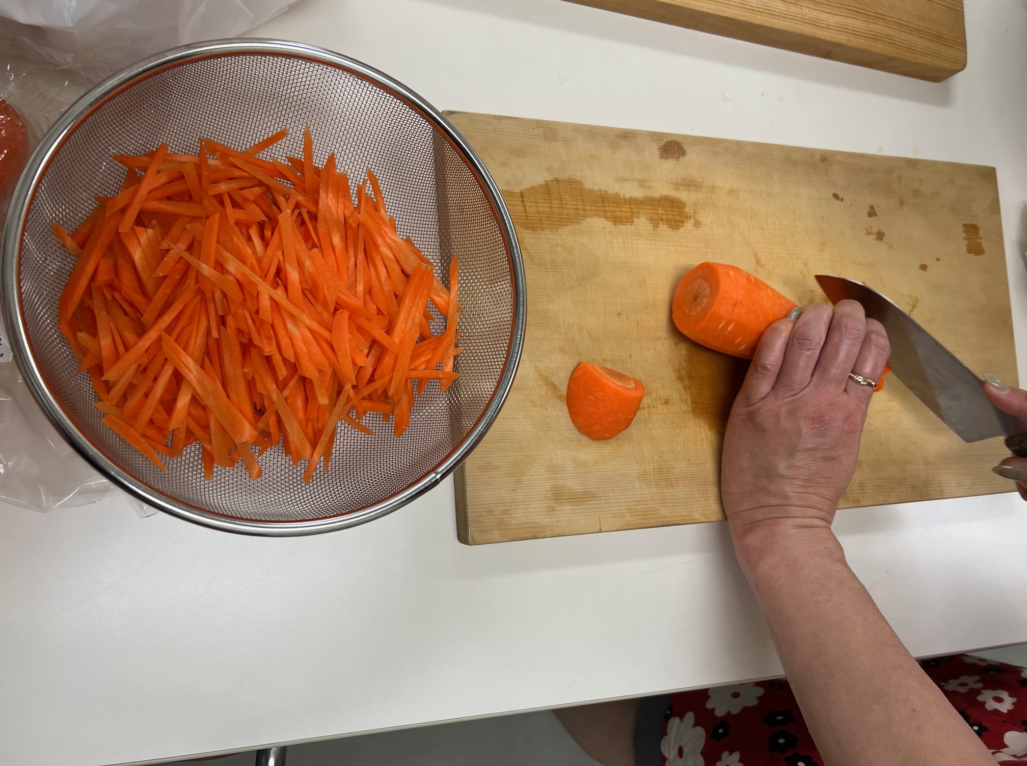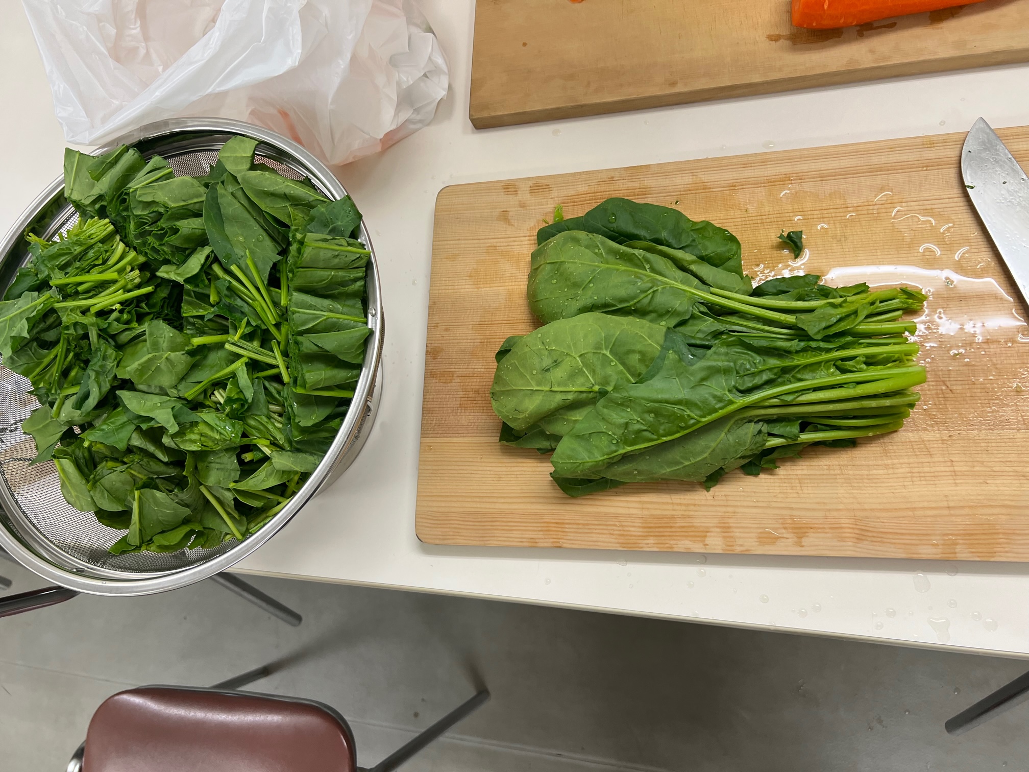 ほうれん草は5cmくらいに切り、にんじんも同じくらいの長さで細切りにします。