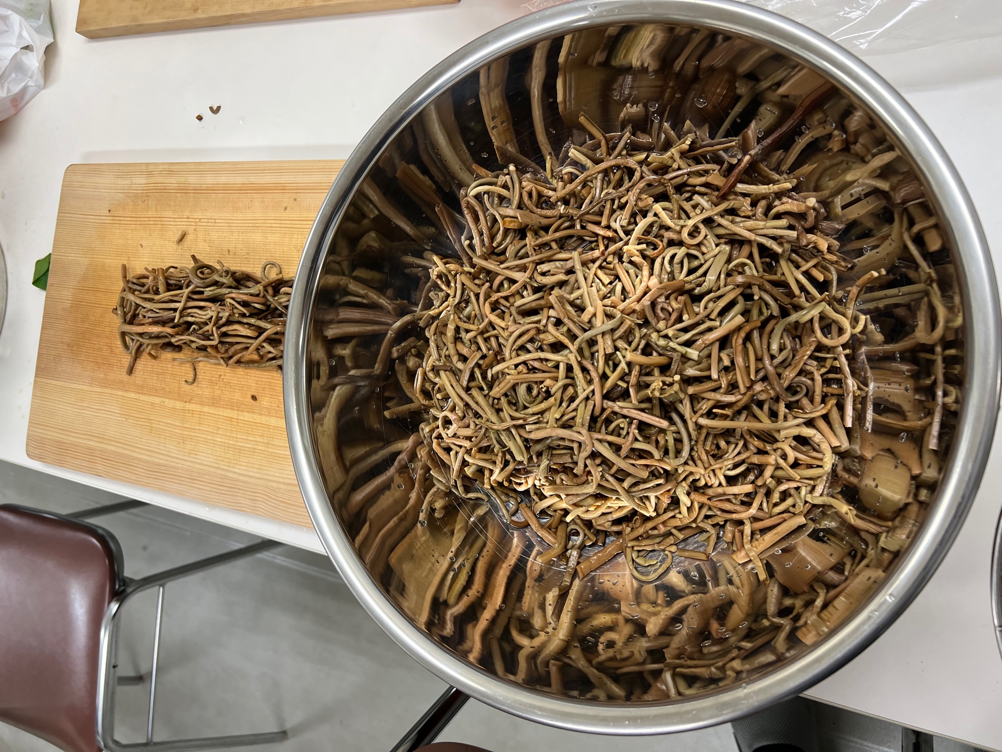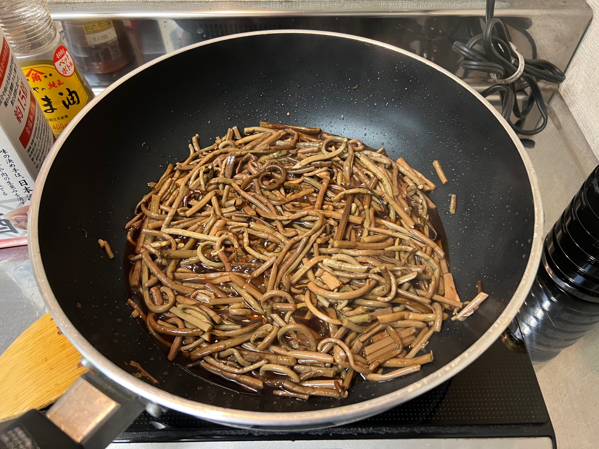 ぜんまいはごま油でさっと炒めてから、酒、醤油、砂糖で煮込んでいきます。