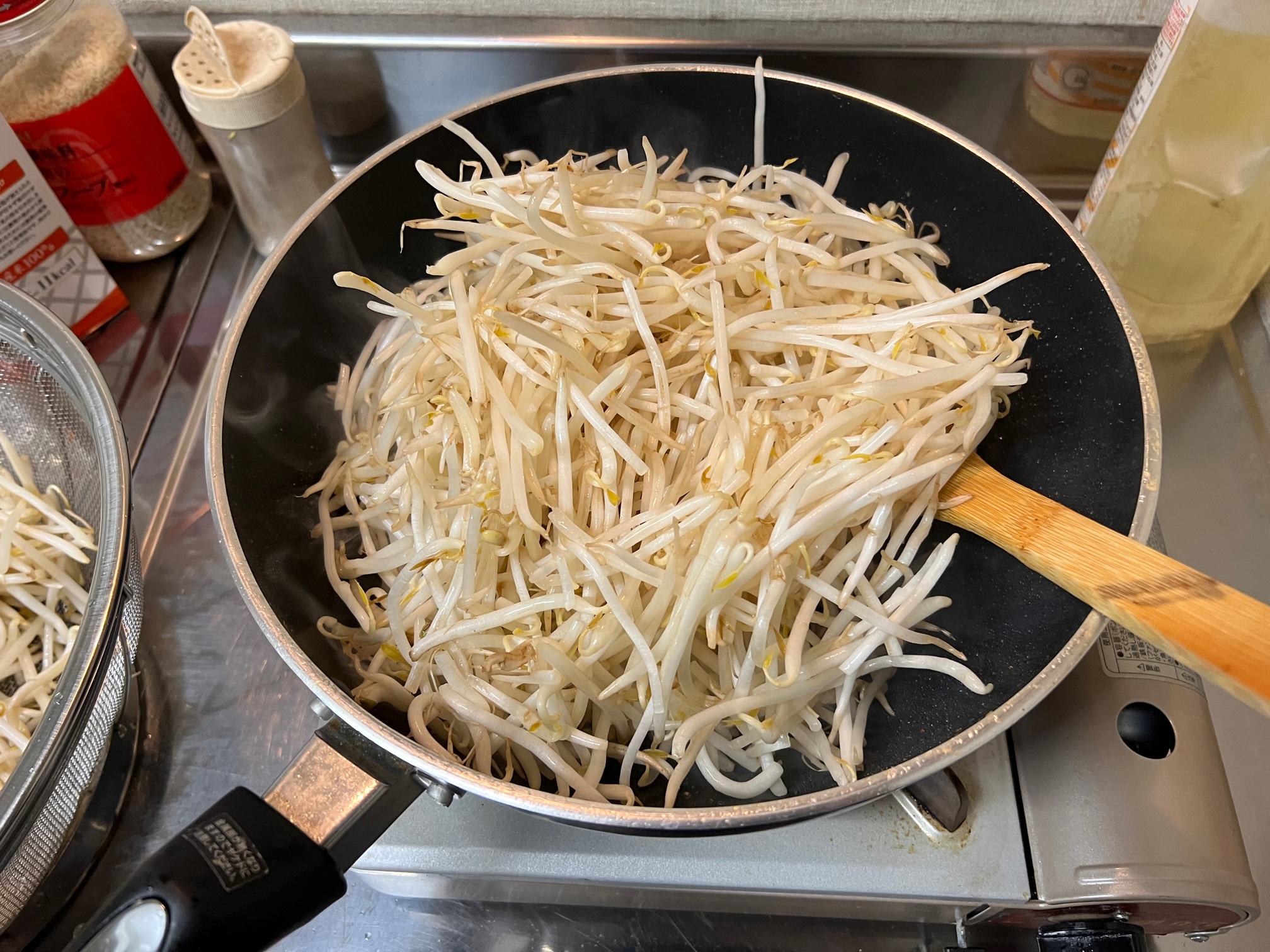 ぜんまいは食べやすい長さになる様(適当)に刻んで、もやしはザルに入れて洗っておきます。