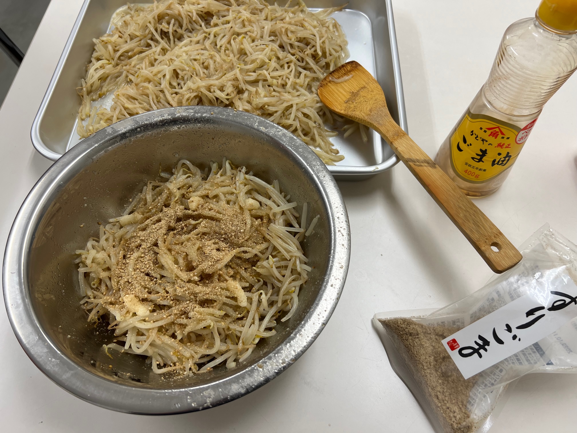 炒め終わったらボウルに移して、すりごま、にんにく、ごま油を混ぜ合わせたら完成。
