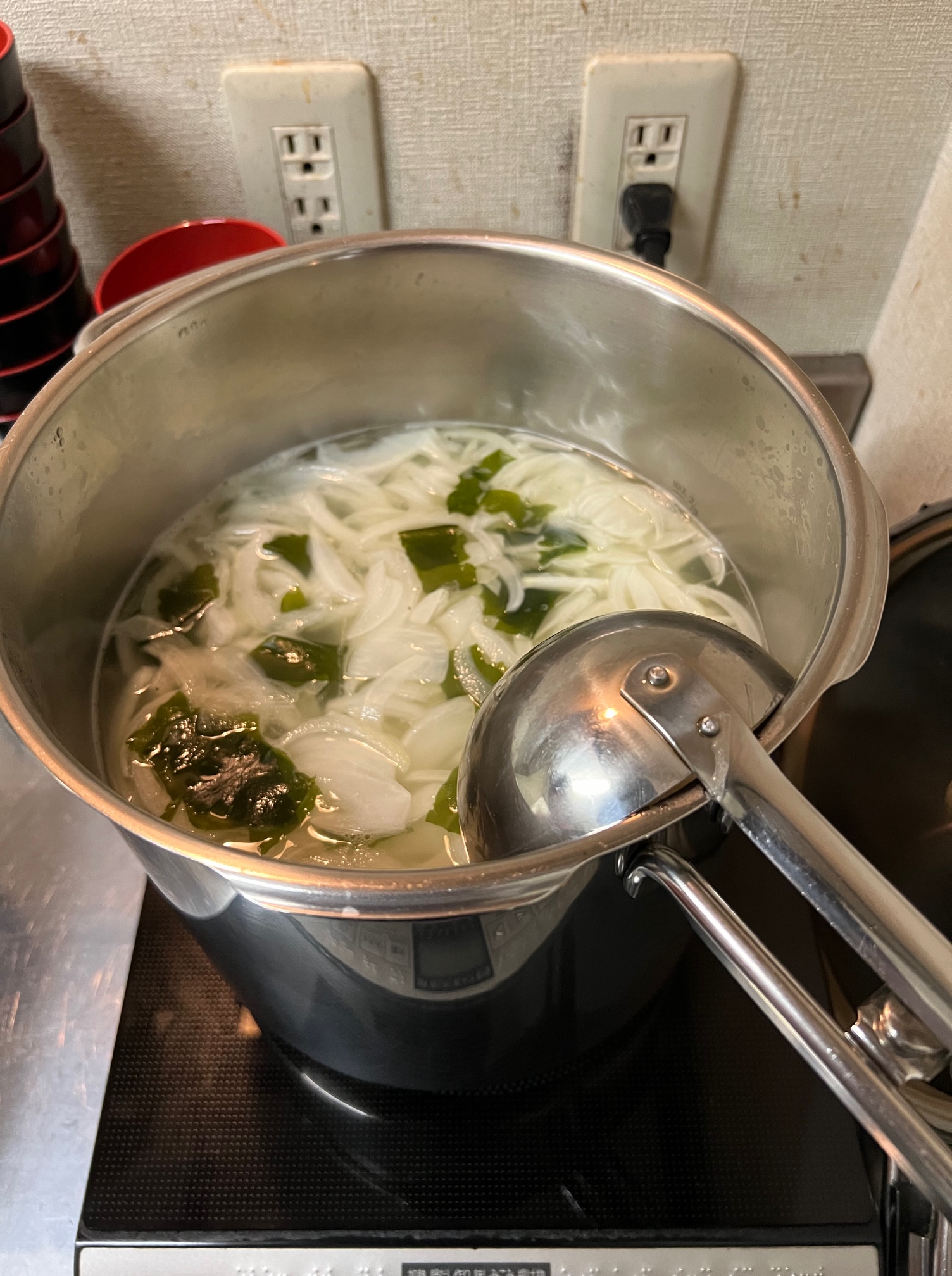 鶏ガラのスープに玉ねぎとわかめ、醤油を少し足して味を調えています。