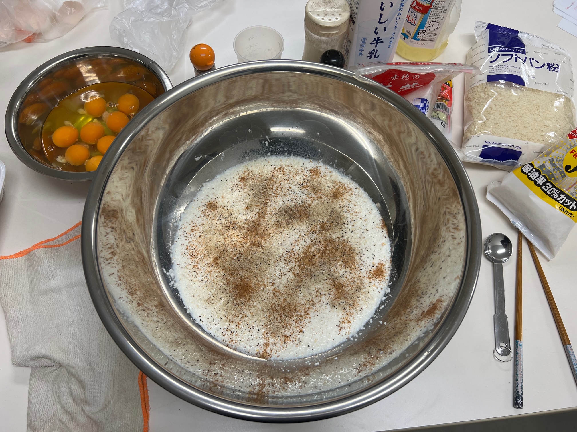 あとは牛乳、パン粉、溶き卵、塩、コショウ、ナツメグなどを混ぜ合わせてコネコネ・・・
