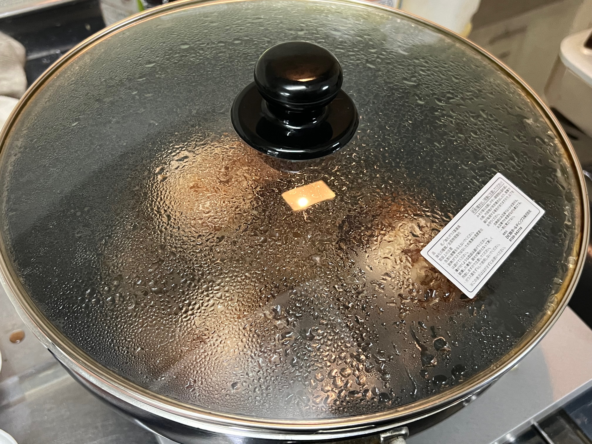 ・ 両面焼き色がついたら、ワインを入れてから蓋をして蒸し焼き