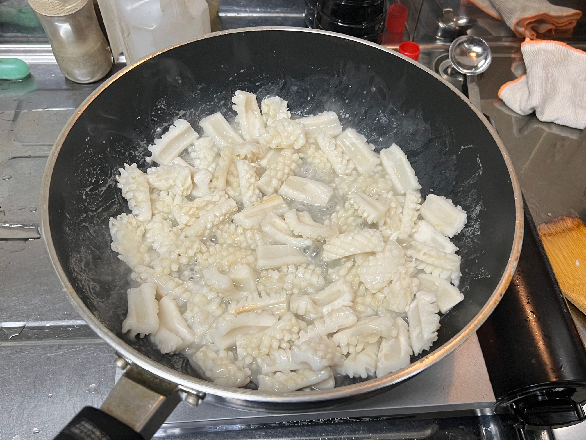 ご飯を3.6升炊き、白菜をザクザクっとカットしてもらっている間に、私は豚肉、エビ、イカの下ごしらえです。