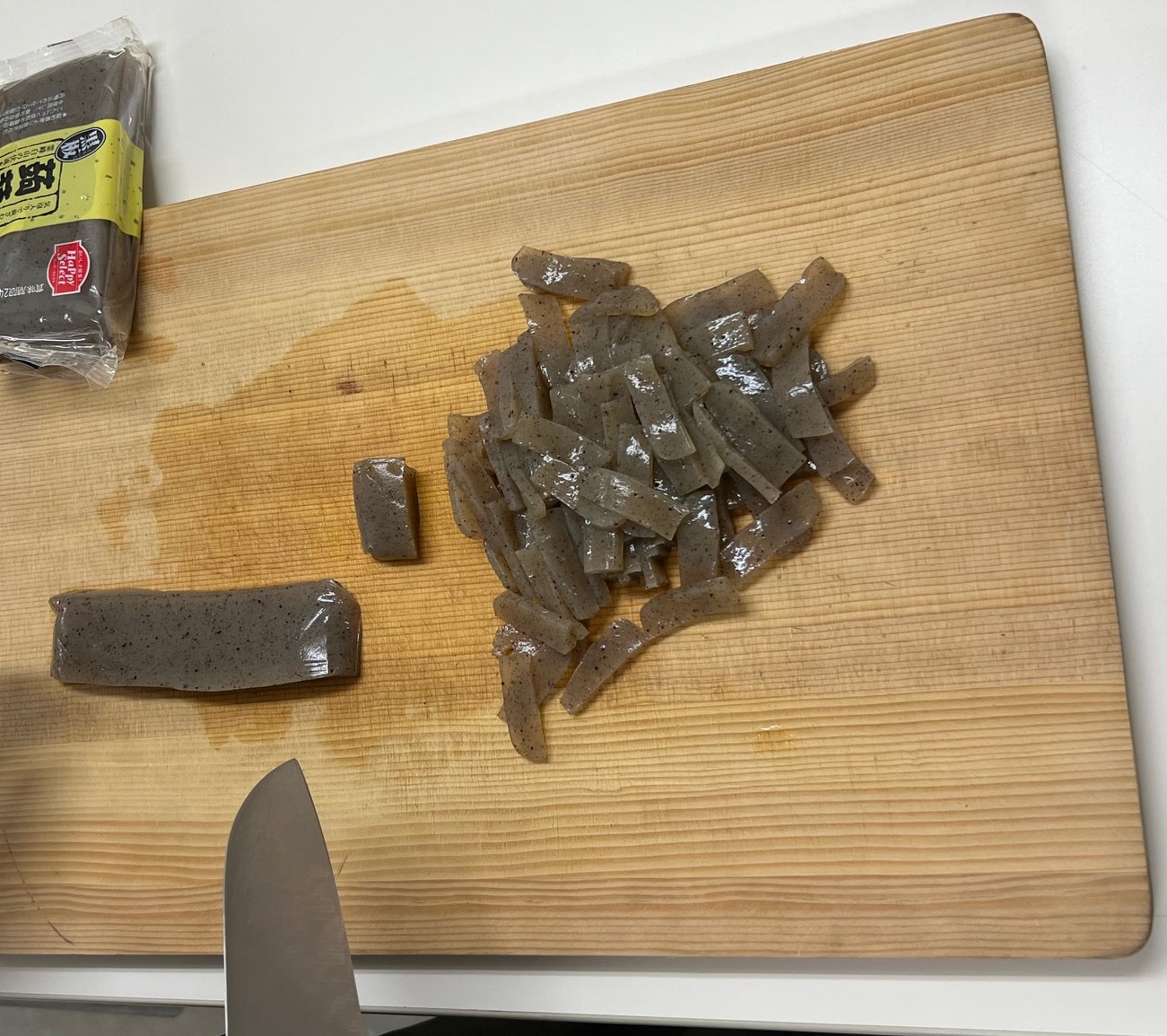 コンニャクは薄く短冊に切り、ごぼうはささがきで刻みます。