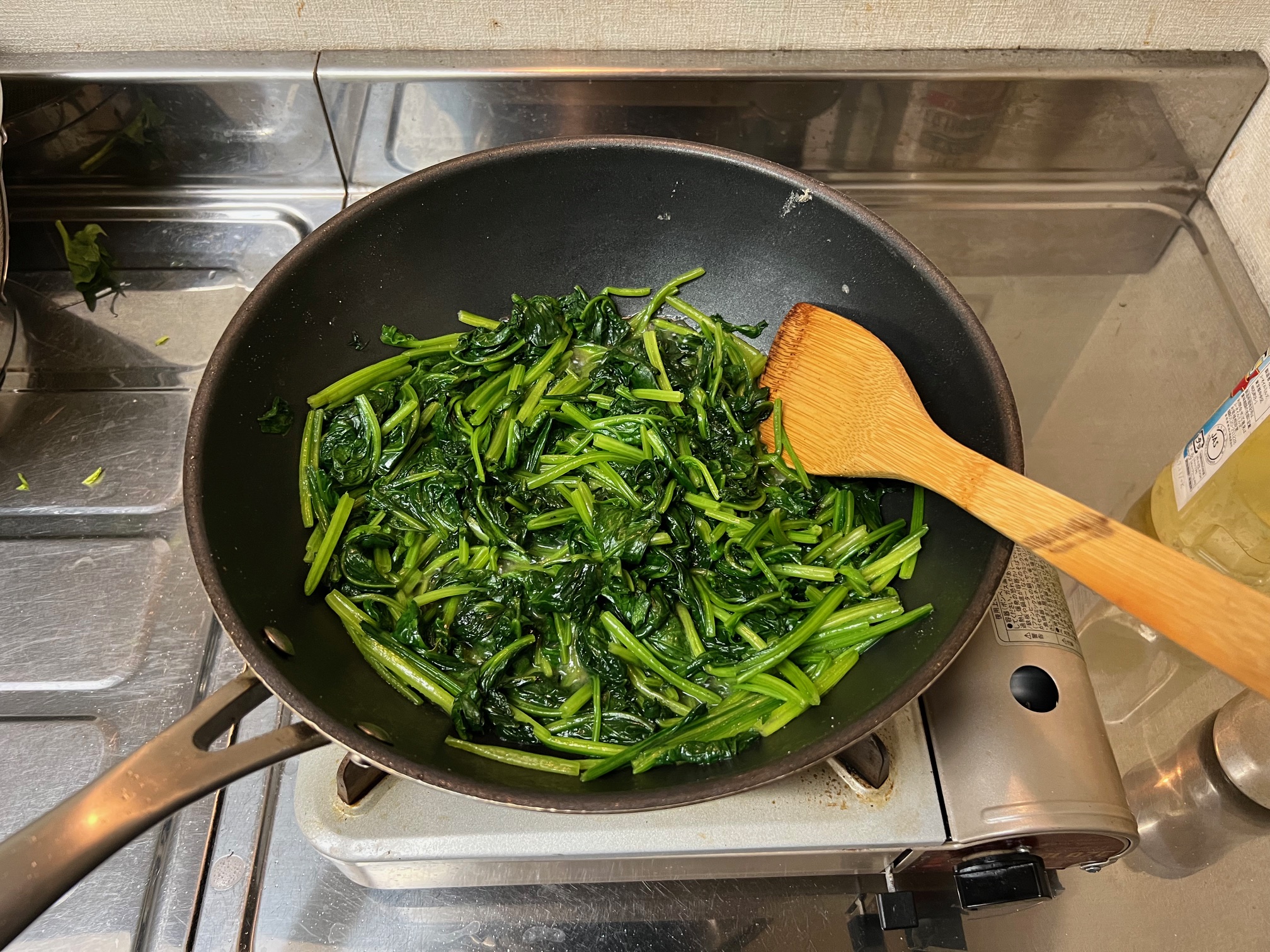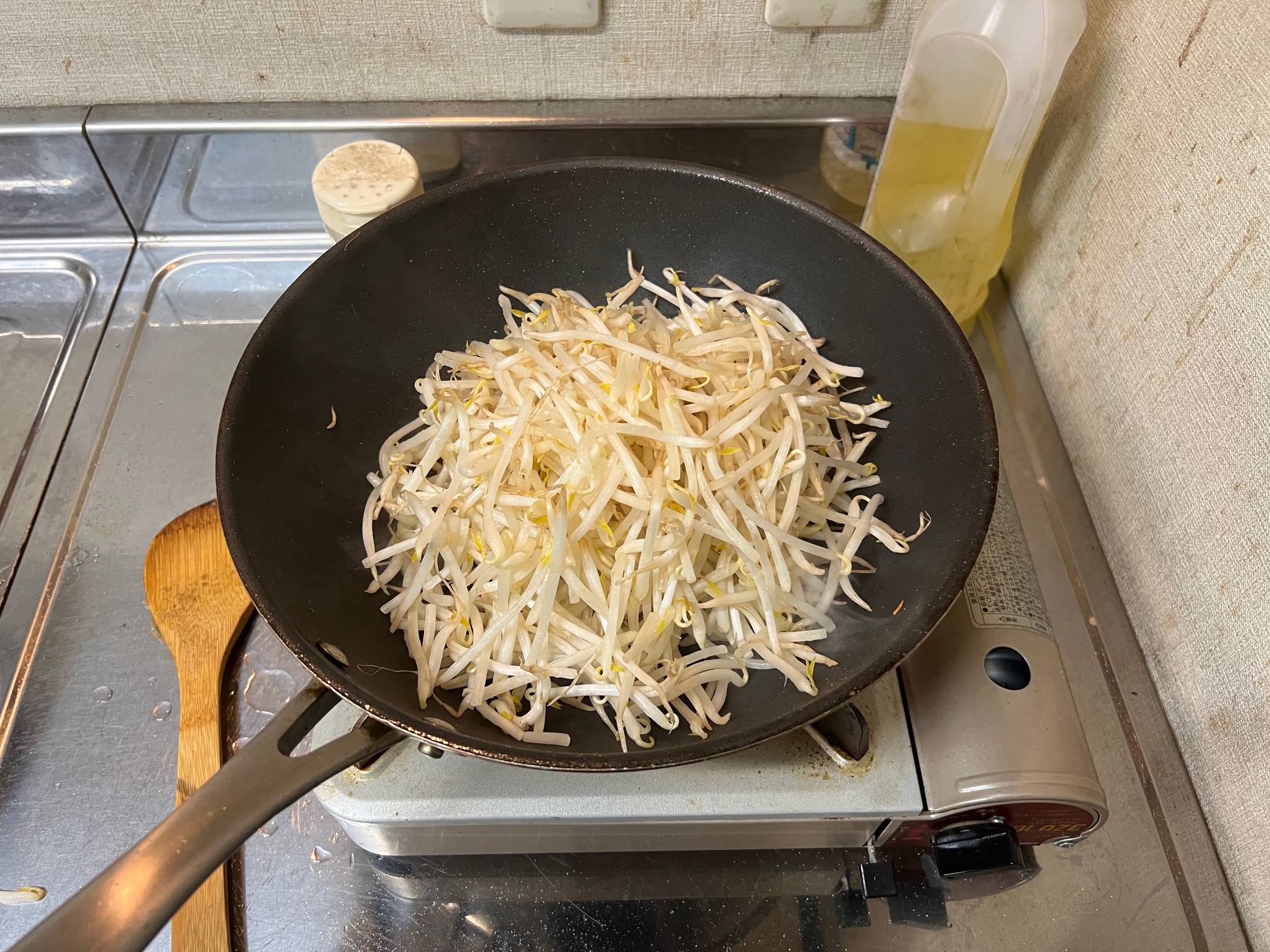 人参、ほうれん草、もやしは、サラダ油で炒めていきます。