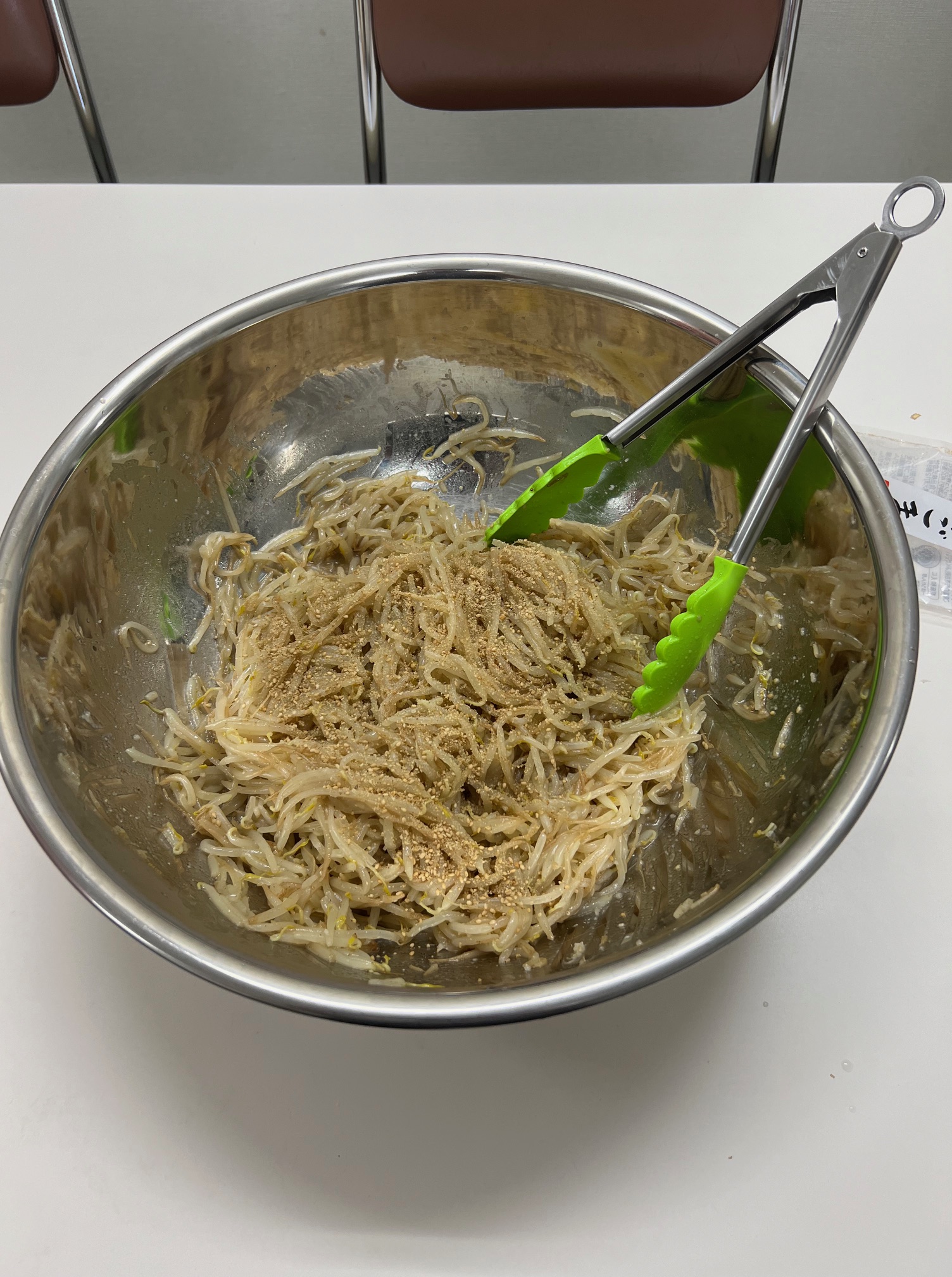 ほうれん草ともやしは水が出ますので、炒め終わったらザルに上げて水を切ります。