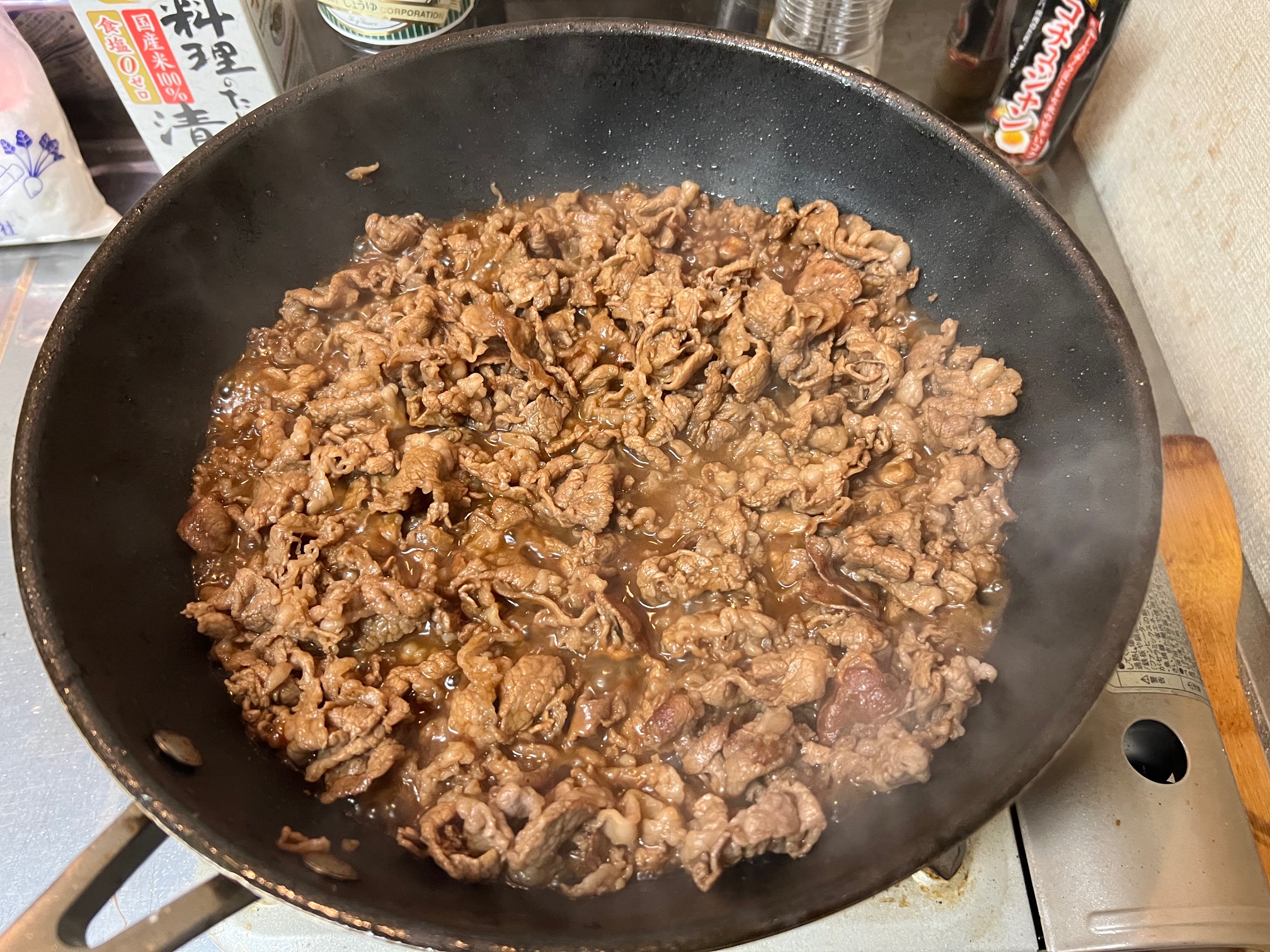 先に砂糖を入れることで、お肉が柔らかくなるんだそうです。