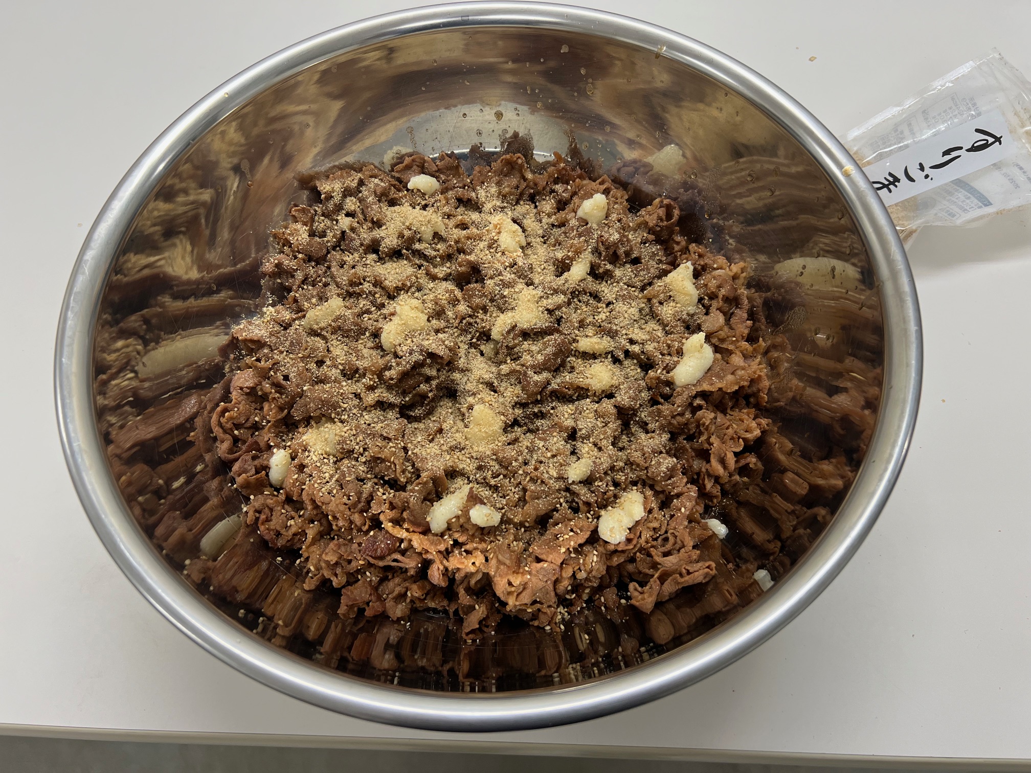 煮込んだお肉をフライパンから上げ、こちらもボウルに投入。