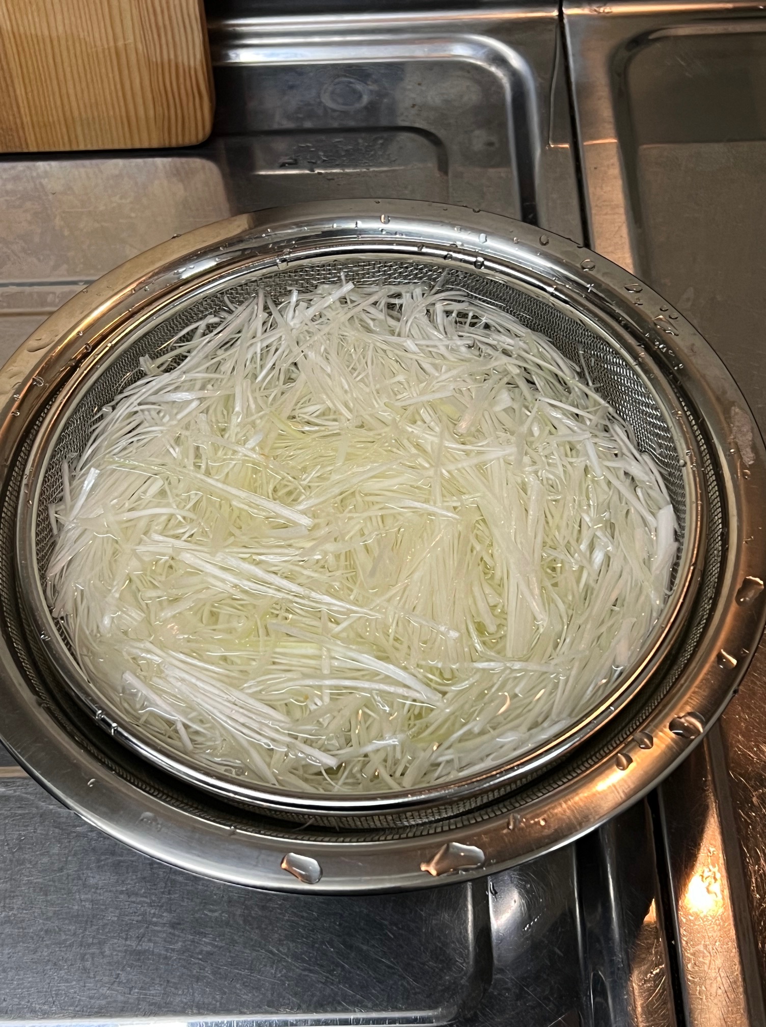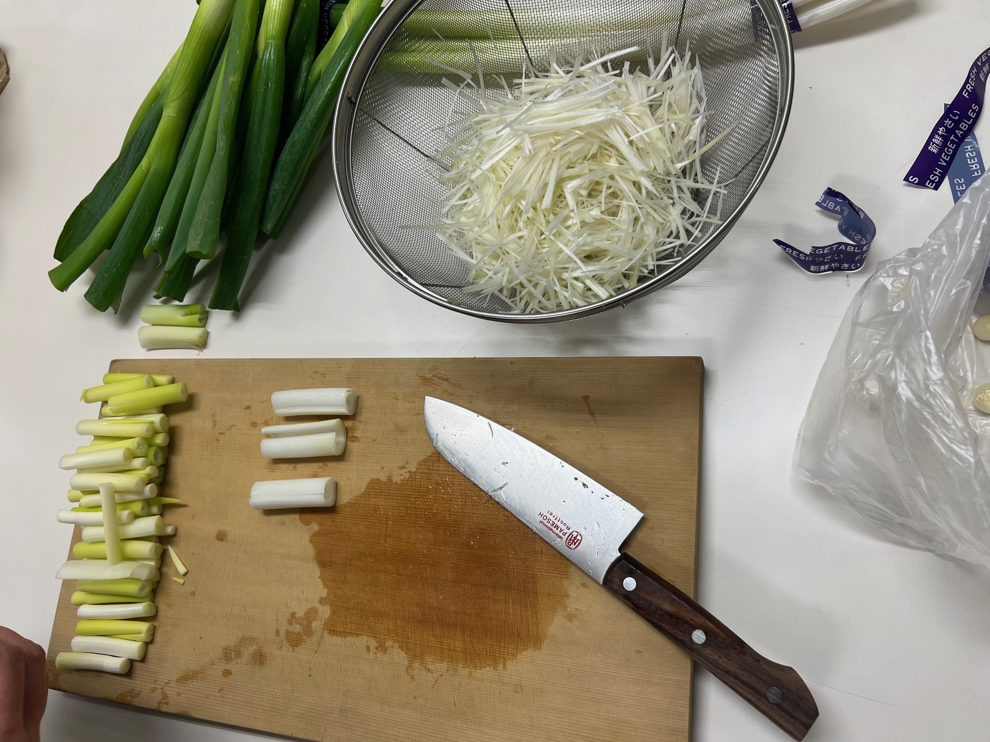 私が鶏肉の下ごしらえをしている間に、手分けをして白髪ねぎを作ってもらっていました。