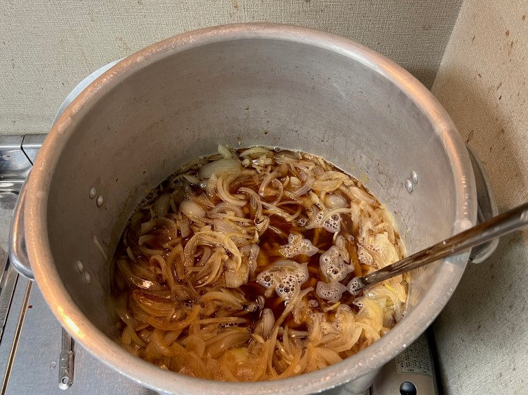 刻んだ玉ねぎは、すぐに寸胴鍋に沸かしておいた出汁に投入していきます。