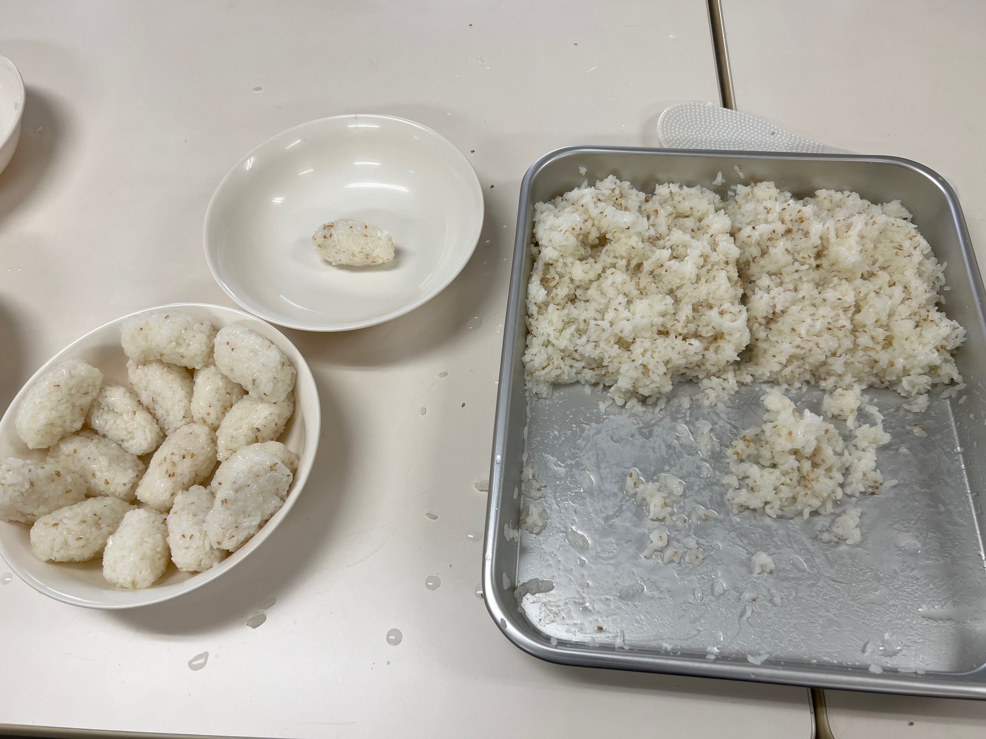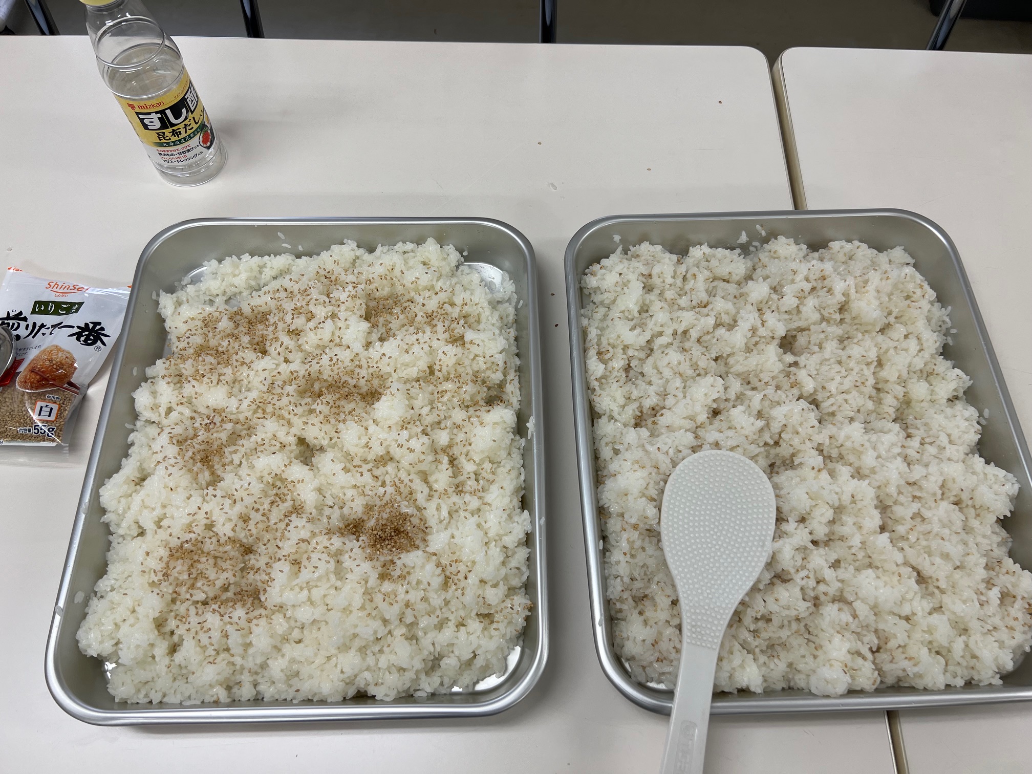 ご飯が炊けたらバットに移し、すし酢と煎りゴマを混ぜて酢飯を作ります。