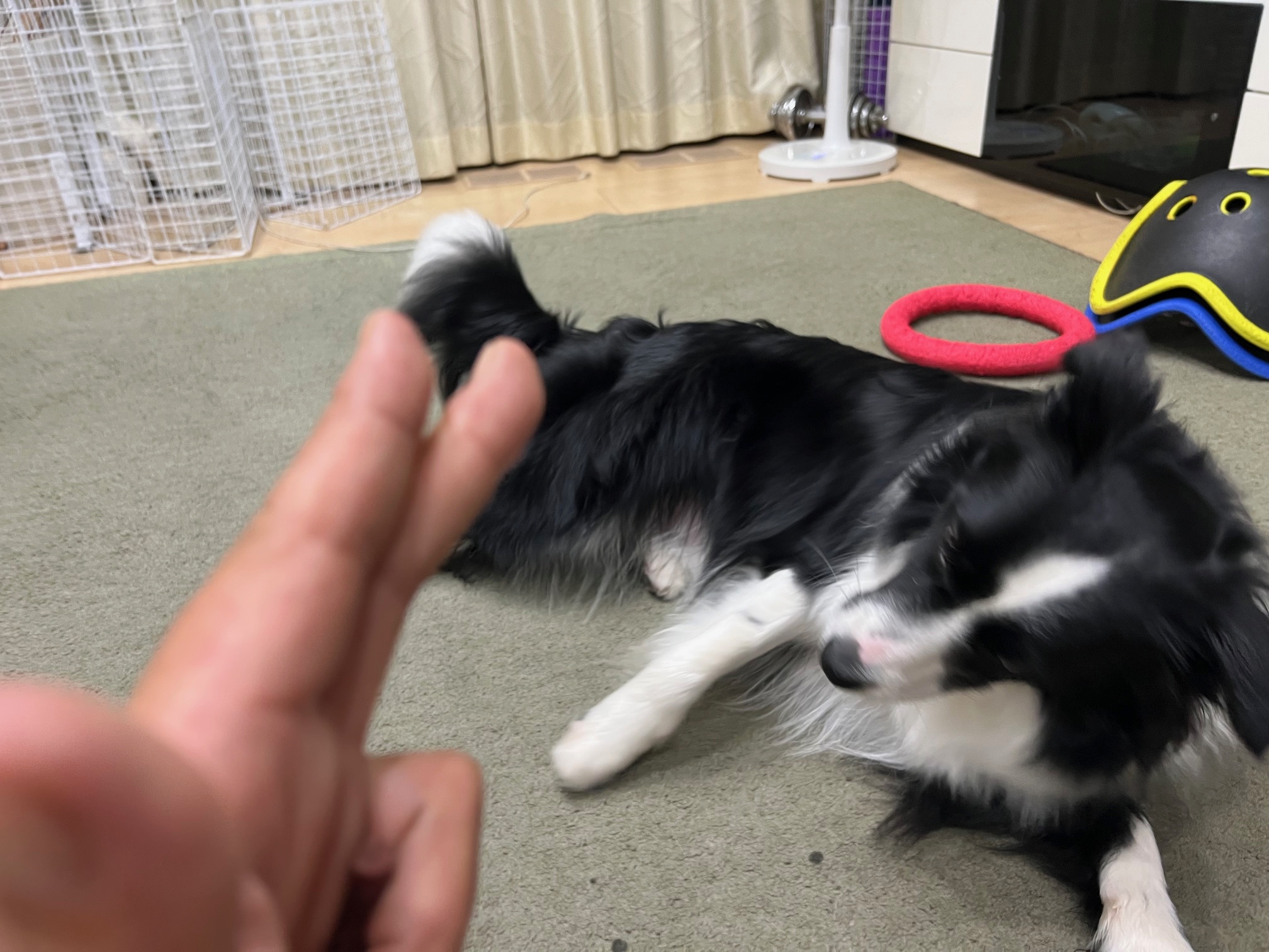 お座りの状態で「バーン!」と銃を撃つジェスチャーをすると、ゴロンとひっくり返ります。。。