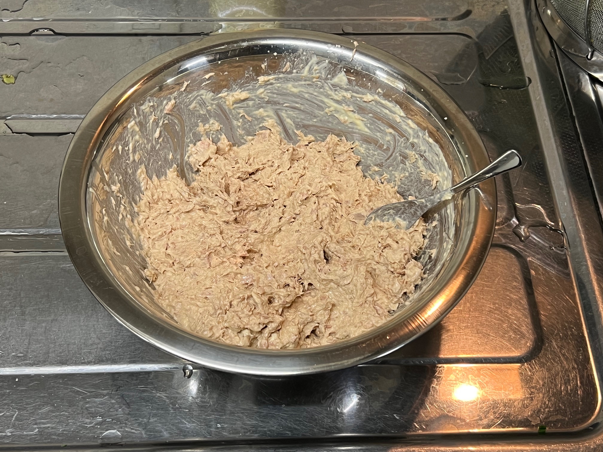 ツナ缶は計10缶を油を切ってからボウルに入れ、大量のマヨネーズと混ぜ合わせます。