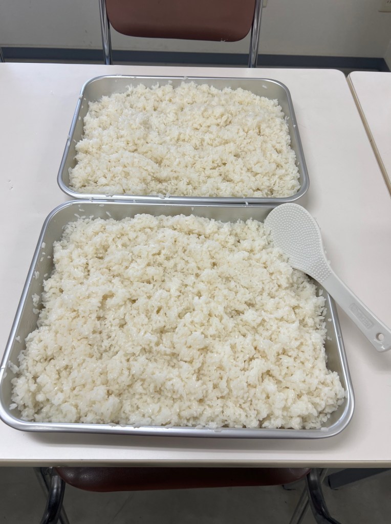 ご飯が炊けたらバットに移し、すし酢を入れてシャリ作りです。