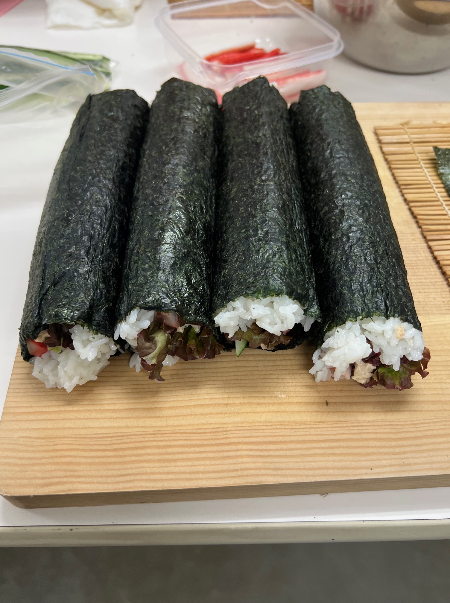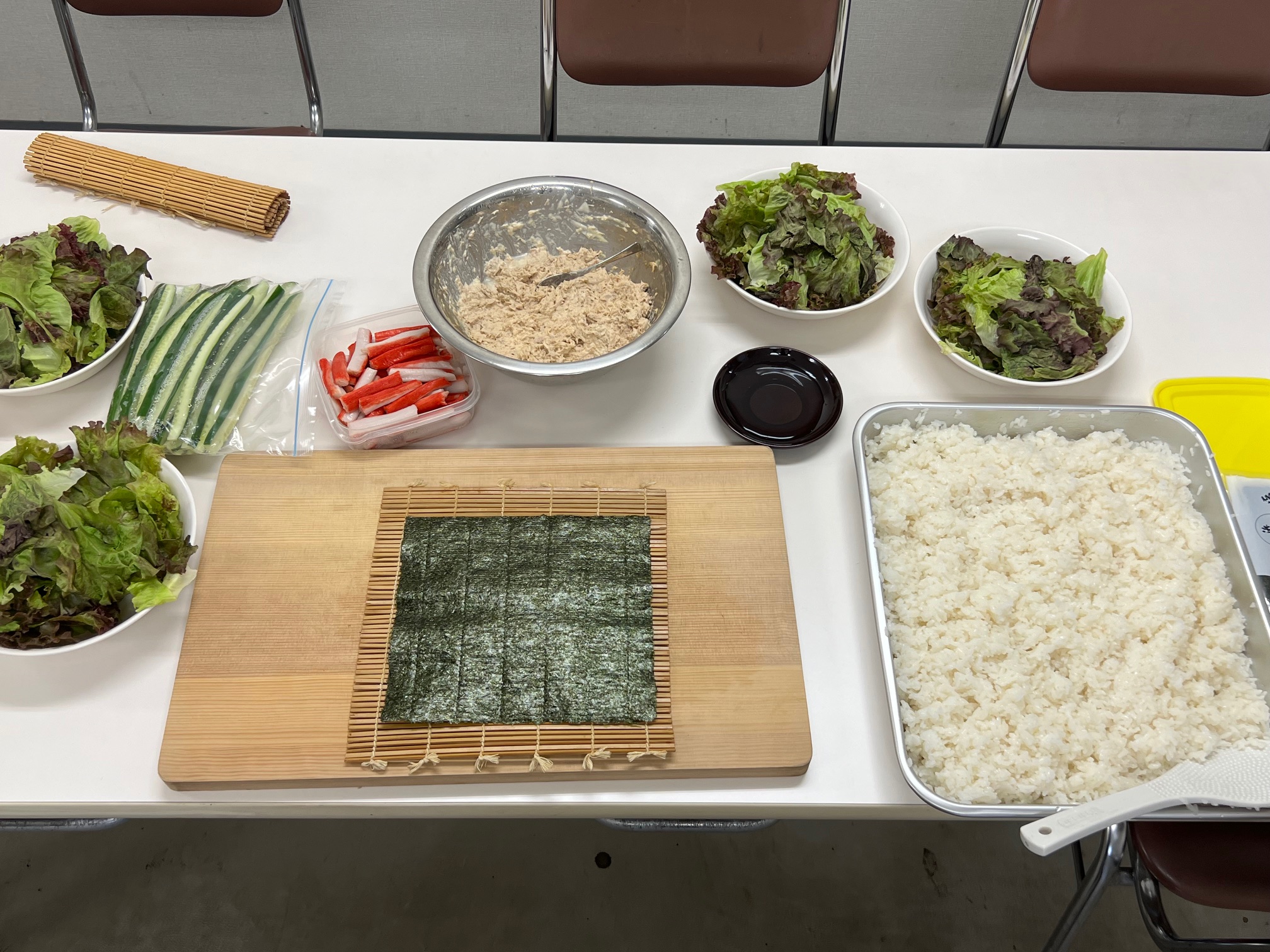最初にやった時なんか、みんなが食堂に来た時点でまだサラダ巻きを巻いている最中だったりしたくらいなんですよね。