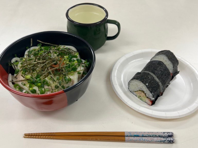 今月のメニューは毎年恒例の「冷やし月見とろろうどん+サラダ巻き」。