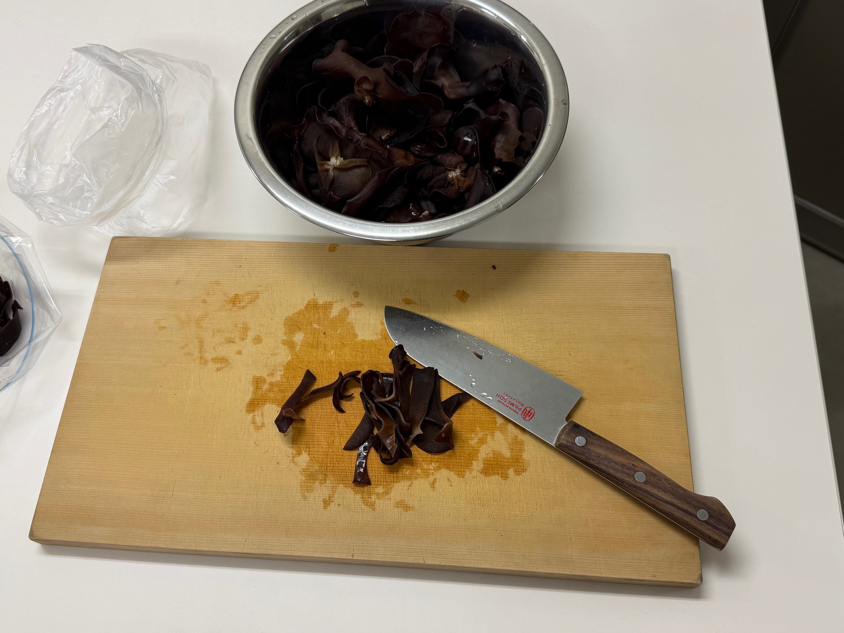 人参は短冊切り、たけのこはいちょう切り、お湯で戻した乾燥きくらげは細切りで刻んでいきます。
