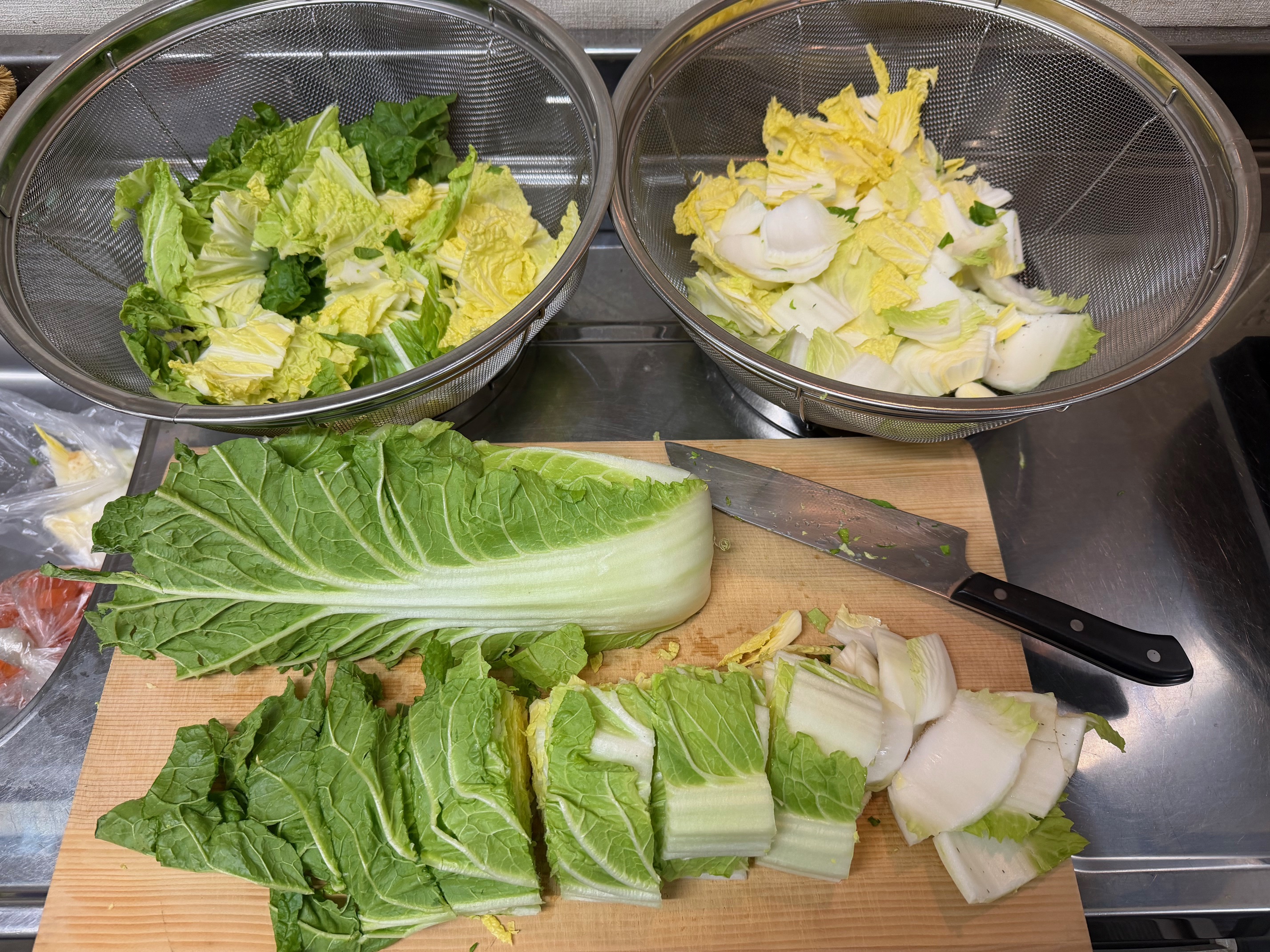 刻んだ白菜は、葉の部分と芯の部分に分けてザルに入れ、軽く水で洗ったら完了。