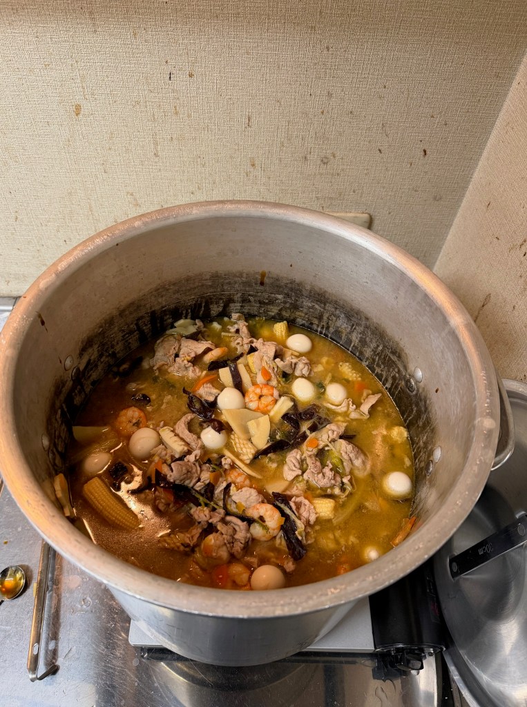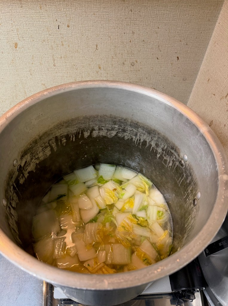 炒め終わった白菜は、寸胴鍋に沸かしておいた鶏ガラスープに投入。