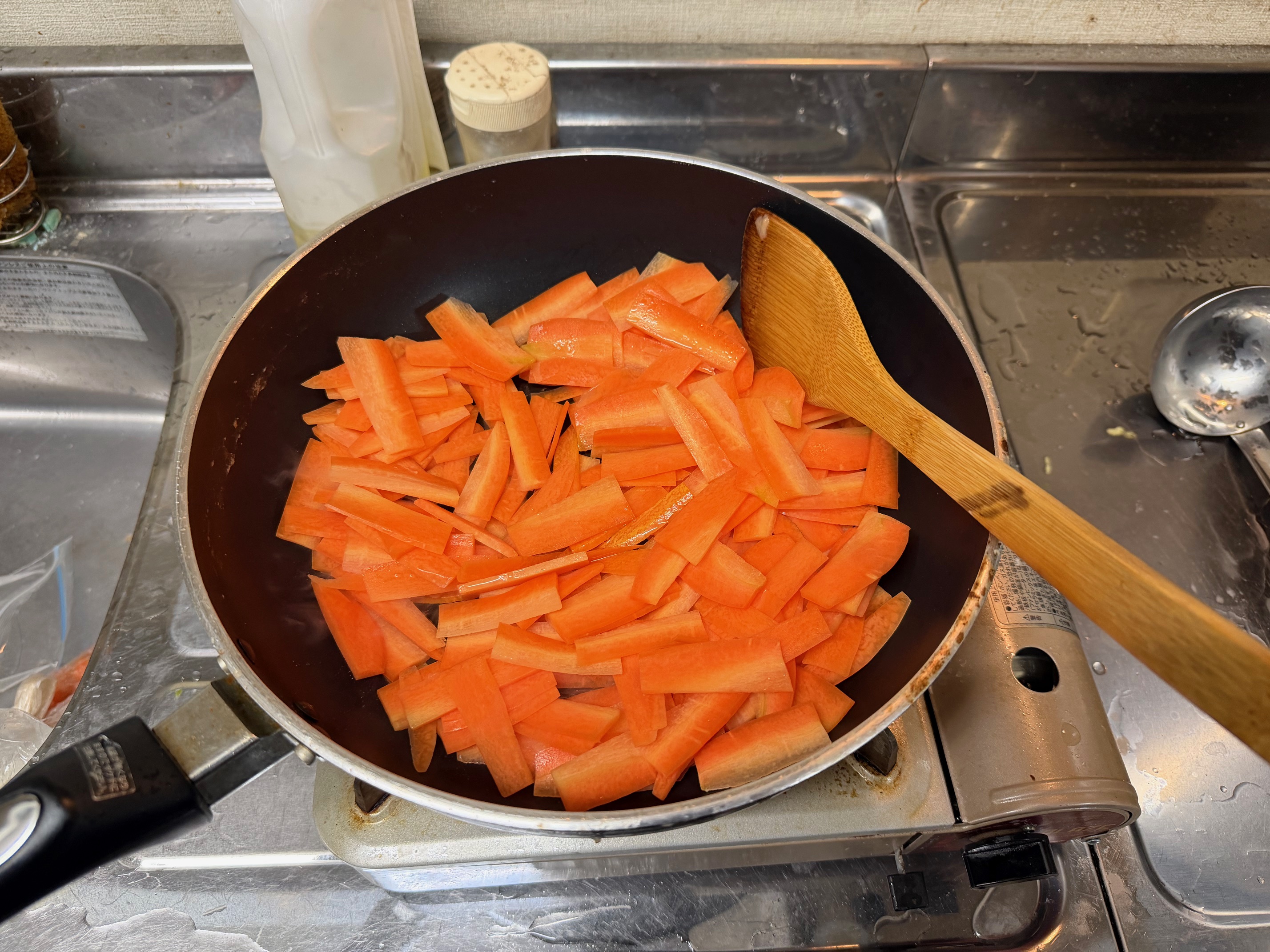前日に刻んでおいた人参、たけのこ、きくらげも同様に、サラダ油で軽く炒めてから鍋に投入します。