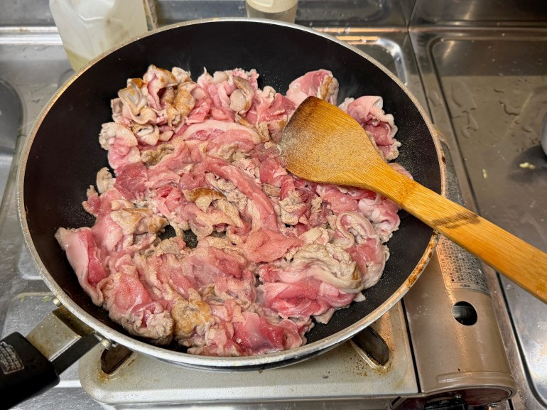 続けて豚肉も炒め、鍋に投入していきます。