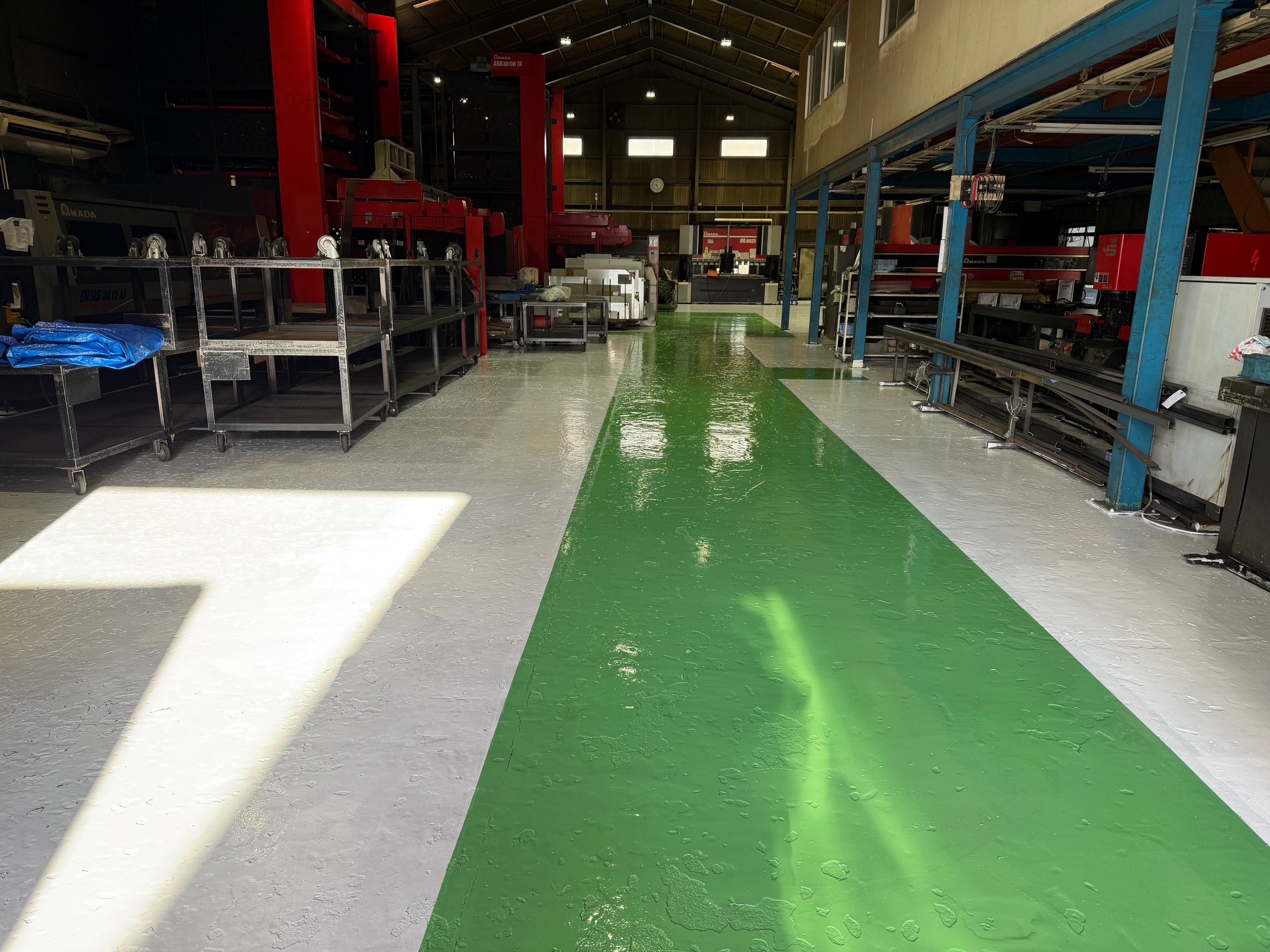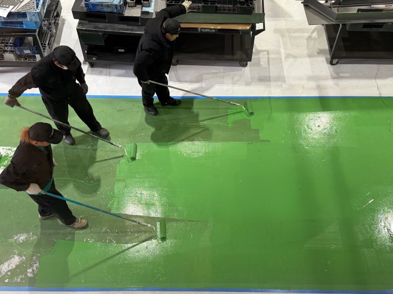 前日に塗っておいた白のエリアに荷物を移動し、通路を緑色のペンキで塗っていきます。