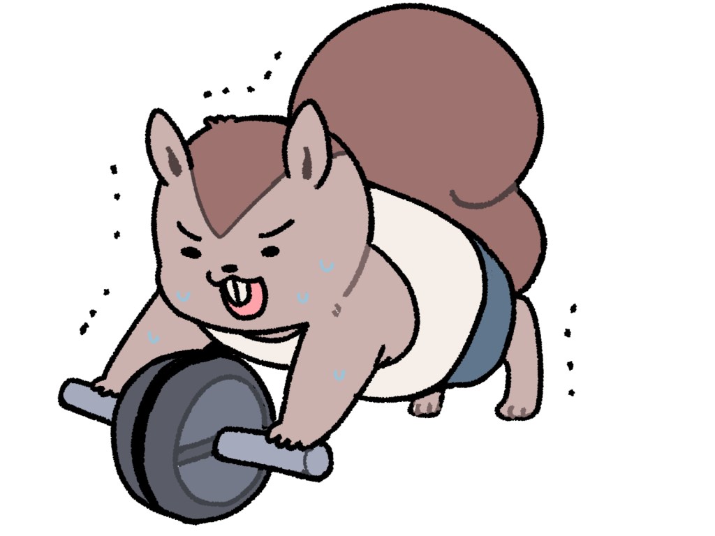 今やっているのはプッシュアップやクランチ、スクワットなんかの自重トレーニングと、ダンベル(10Kg×2)とかアブローラーを使ったトレーニングです。