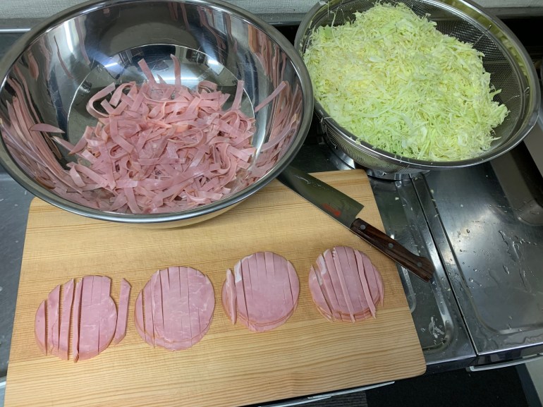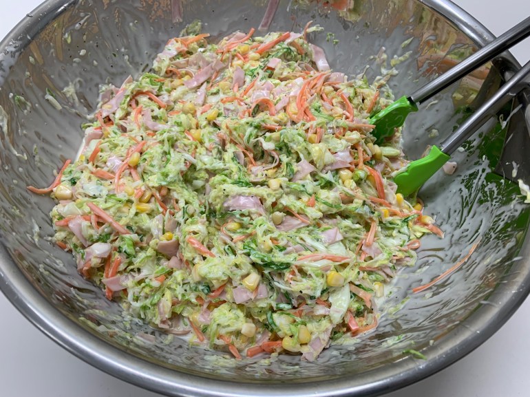具材はキャベツ1.5玉と人参3~4本を千切りしてから塩もみ、あとはハムとコーンに特製ドレッシングを入れて混ぜるだけ。。。